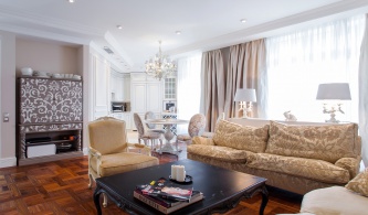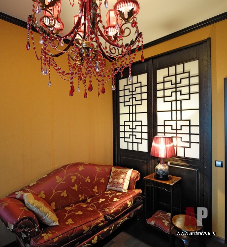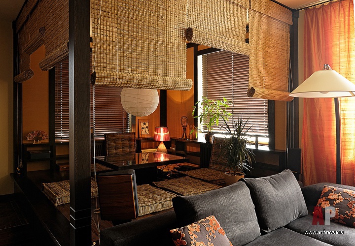 Заказчики обратились с пожеланием создать из небольшой трехкомнатной московской квартиры модное, стильное и неординарное жилье с элементами восточной стилистики. Архитектор предложила обыграть в интерьере японскую тематику. В итоге в гостиной появилась чайная зона с подиумом, татами и рулонными шторами.