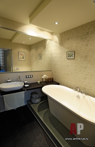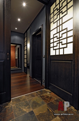 Интерьер квартиры оформлен в переосмысленной на современный лад японской стилистике. Контрастная цветовая гамма, столярные изделия с геометрическим рисунком, керамогранит, имитирующий натуральный камень – все работает на сложный этнический образ. Декоративная доминанта квартиры – чайная зона на подиуме.