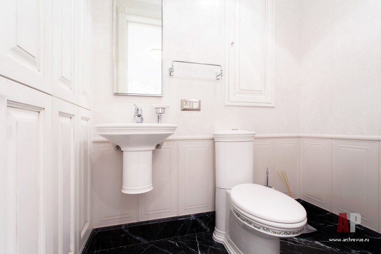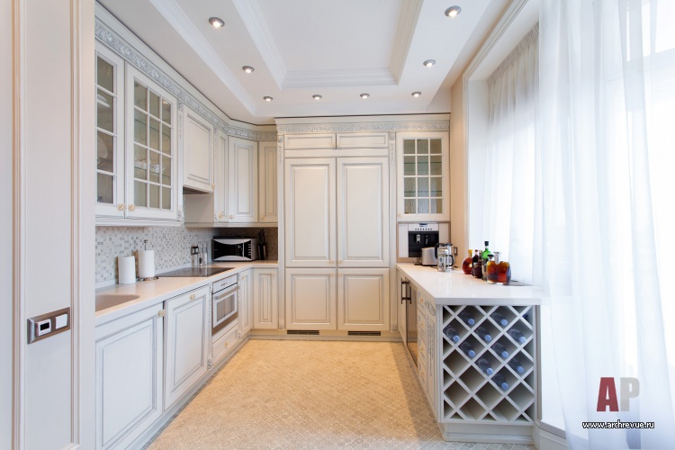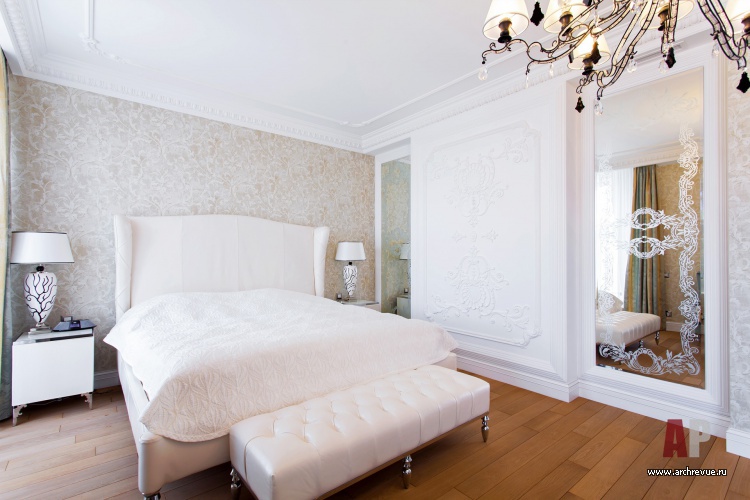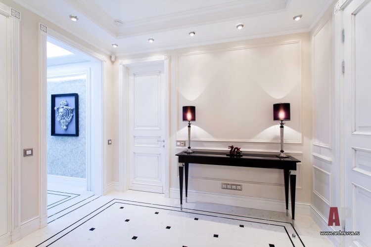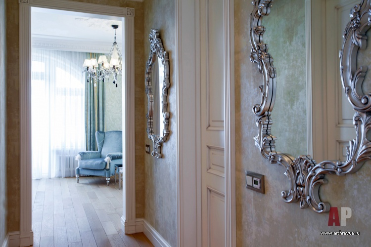 Дизайн квартиры выполнен в современной классике. Традиционную стилистику подчеркивают индивидуальные столярные изделия из дерева с белым финишем, а также лепные карнизы, потолочные розетки и настенные барельефы, украшенные рамами. Настроение гостеприимного загородного дома создает неоклассический камин в гостиной, а также белоснежный парадный холл с зеркальным «венецианским» шкафом.