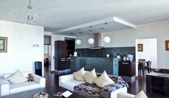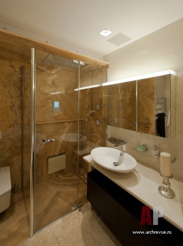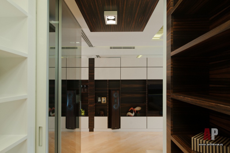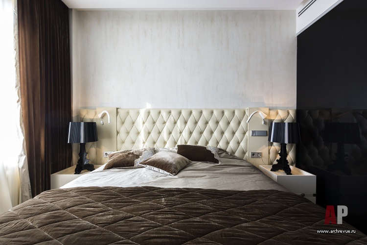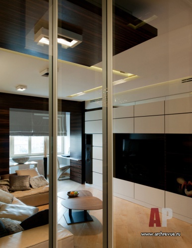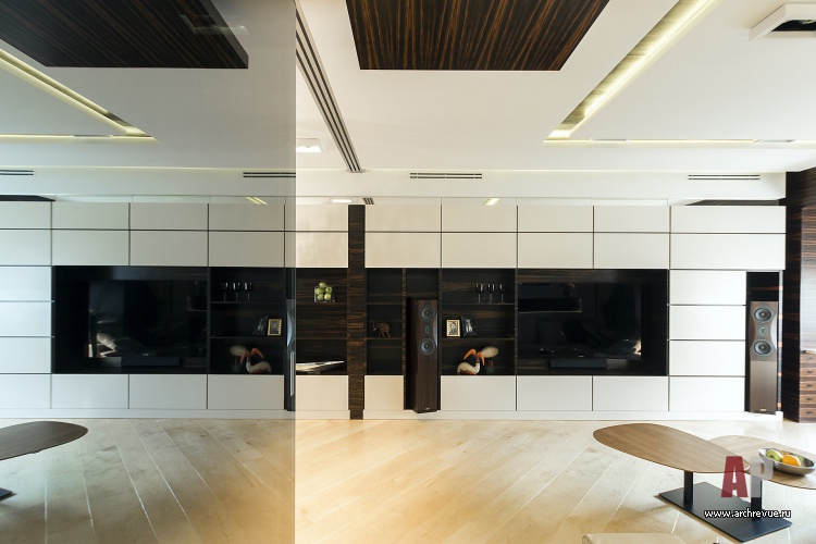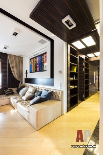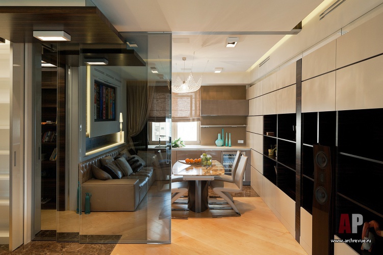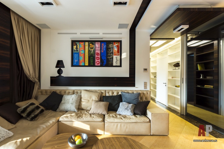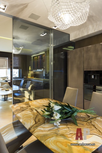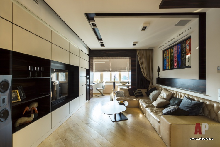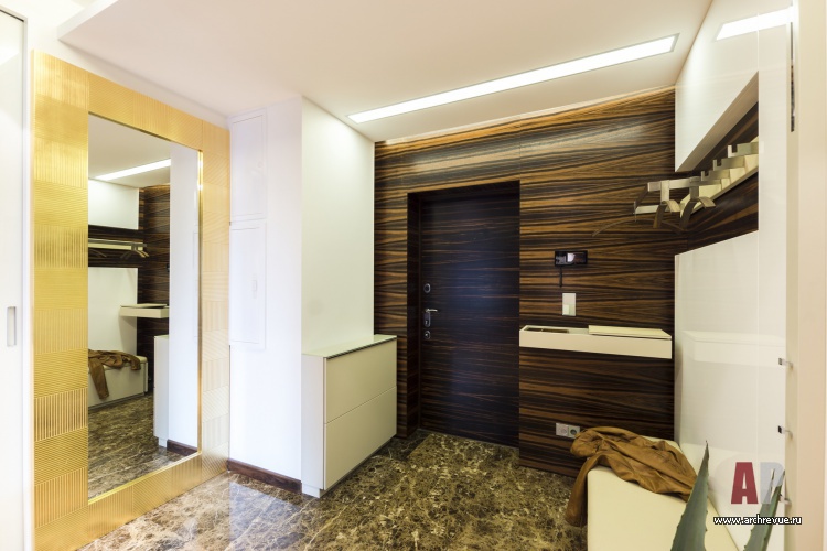 Дизайн квартиры выполнен в современном минималистском ключе. Интерьер выглядит строго и лаконично за счет четких линий, контрастных сочетаний бежевого с темно-коричневым и черным, микса из камня, дерева и стекла. Важную роль в облике интерьера играют всевозможные ниши и прорези из темного и светлого дерева и гипсокартона, они проходят по стенам и потолкам и акцентированы встроенной подсветкой.