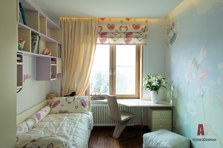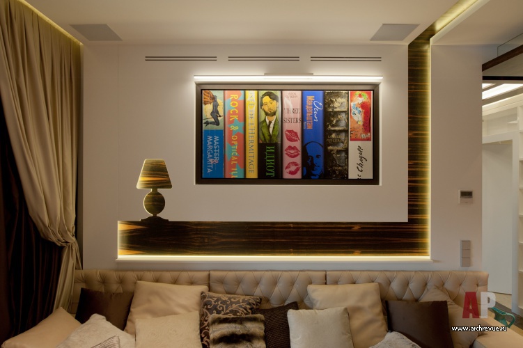 «Между собой этот проект мы называли «Волшебная лампа». И все из-за ироничной детали – силуэта настольного светильника, который вырезан из дерева и украшает одну из стен в гостиной. Подсветка по периметру лампы придает плоской поверхности объем и создает эффект глубины и дальнего плана».