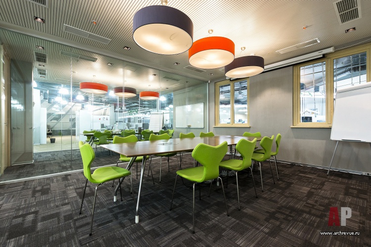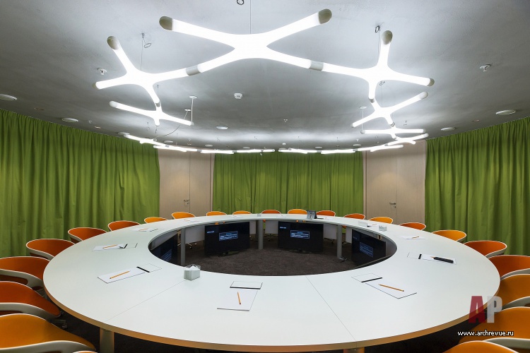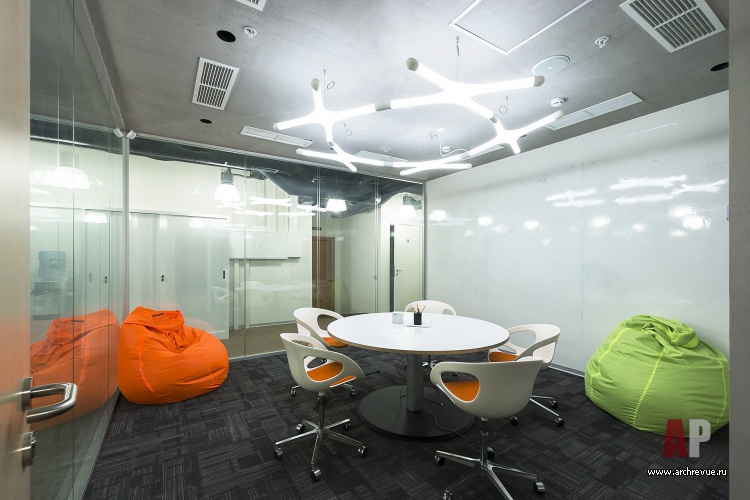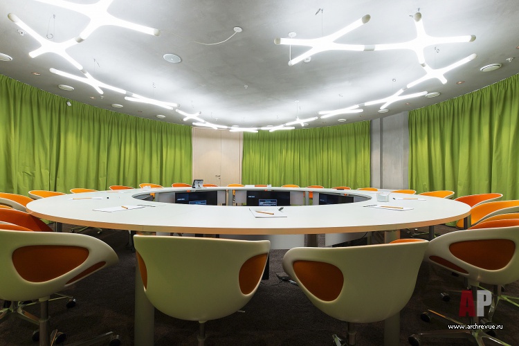 Именно поэтому рассадка в офисе свободная. Рабочие зоны руководителей подразделений расположены в углах здания и также интегрированы в общий объем. В едином пространстве выделены только объемы переговорных залов: две больших (круглая и прямоугольная) на 20-30 человек и несколько маленьких, рассчитанных на 5-10 сотрудников.