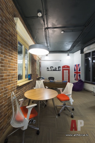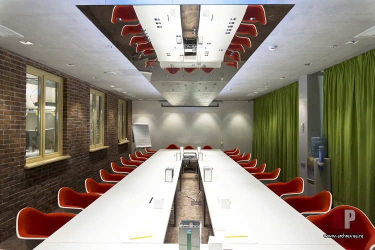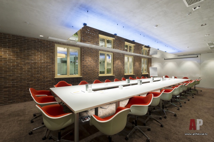 Основную декоративную линию оформления офиса подсказала само здание – после демонтажа старой отделки в мансардном этаже открылись оконные проемы. Архитекторы вставили в них окна и обыграли в тему уличного оформления с кирпичными фасадами, мощеными дорожками, бетонными стенами стеклянными витринами городских фасадов. С урбанистическим дизайном сочетаются традиционные для современных офисов декоративные элементы: темные потолки, открытые коммуникации, технический свет и дизайнерская яркая мебель.