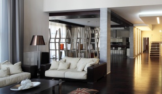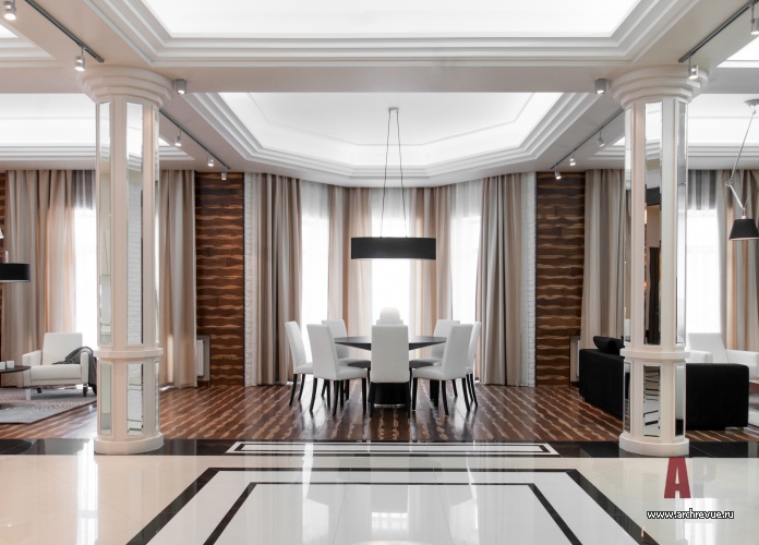 Работая над планировкой дома площадью 450 кв. м, архитекторы предложили первый этаж превратить в открытый open space. В студийном пространстве, которое зонировано конструктивными колоннами, облегченными зеркальной облицовкой, расположились главные общественные помещения: гостиная, столовая, телевизионная группа, кухня и лестница, ведущая на второй этаж.