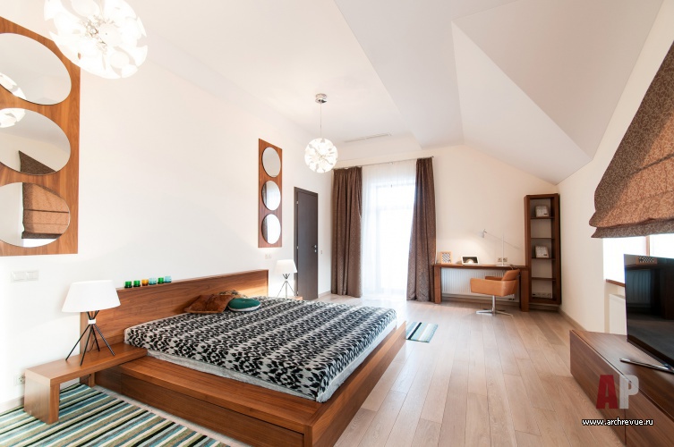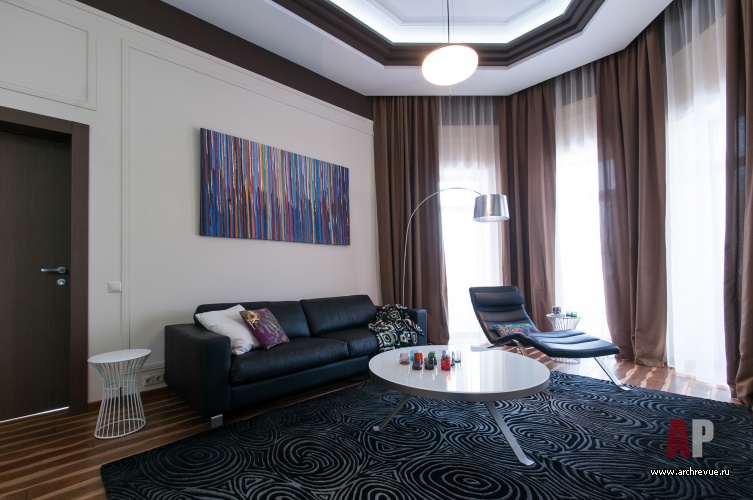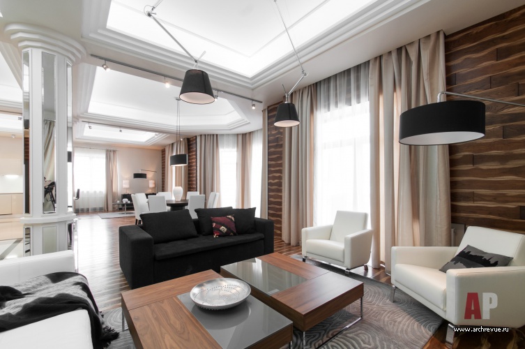 Получившейся художественной доской они выложили не только пол в гостиной, но и стены, благодаря чему интерьер выглядит оригинальным и в то же время уютным. Современная тематика поддержана многоуровневыми потолками, закарнизной подсветкой и дизайнерской мебелью от датского бренда BoConcept.