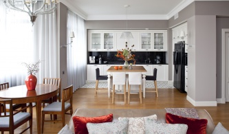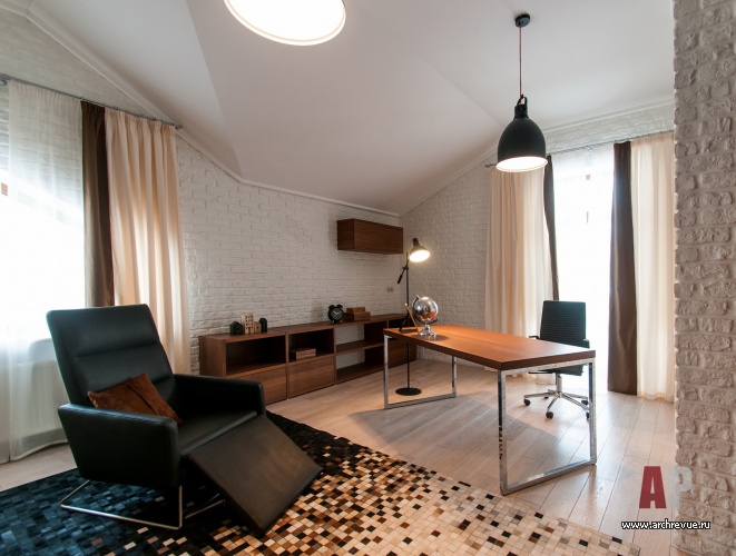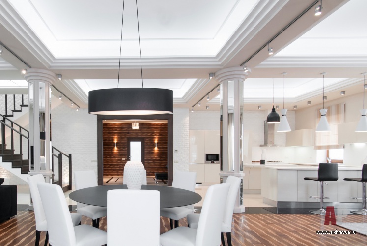 Интерьер современного рационального дома строится на использовании контрастных цветов и фактур: полированного керамогранита трех оттенков (белого, черного и бежевого), настенной плитки с эффектом старой кирпичной кладки, гипсового лепного декора и дерева с природной структурой. С белым глянцем прекрасно работает инженерная доска из дуба, которую архитекторы тонировали и шлифовали, придавая ей сходство с древесиной оливы и американского ореха.