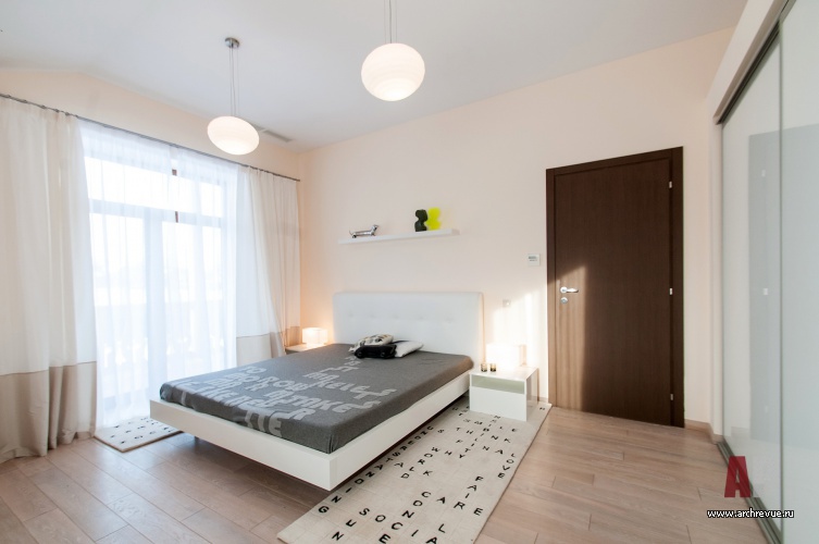 Помимо общей зоны внизу расположен парадный холл, гостевой санузел и технические помещения. На втором этаже находятся три спальни (хозяйская, детская и гостевая) и кабинет. Двери всех изолированных помещений выходят в приватную гостиную, обустроенную в холле второго этажа.