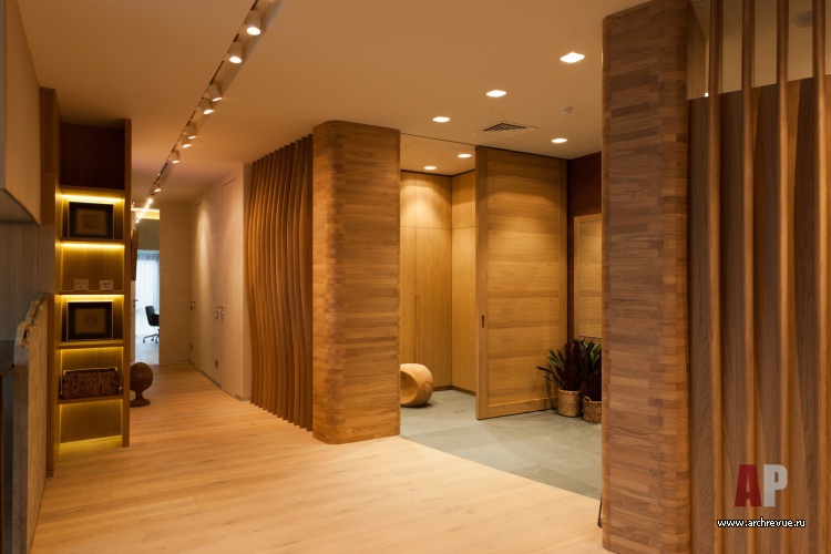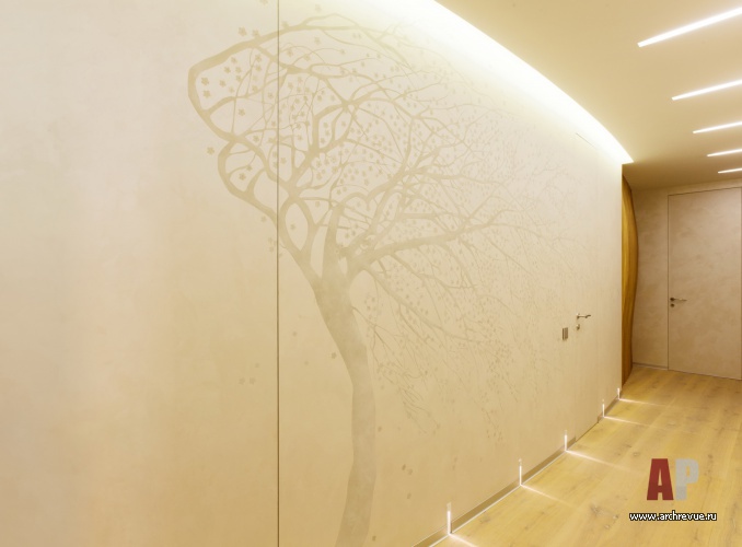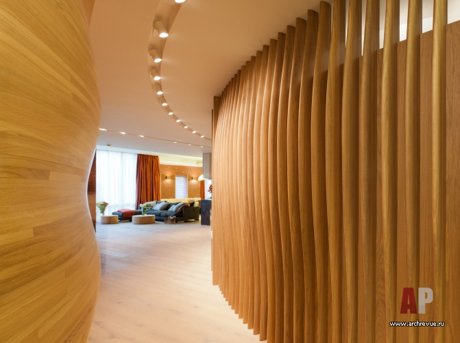 Дизайн-проект строится на использовании природной тематики, форм и материалов. В интерьере солирует светлое дерево: оно использовано в отделке полов, потолков, перегородок сложной криволинейной формы. Ритм пространству задают изогнутые перегородки бионической формы в прихожей.
