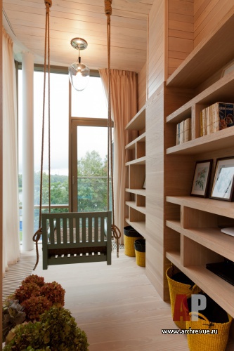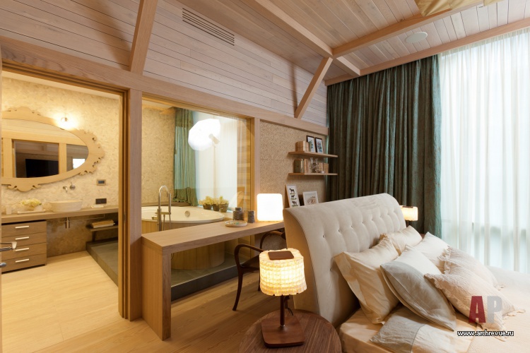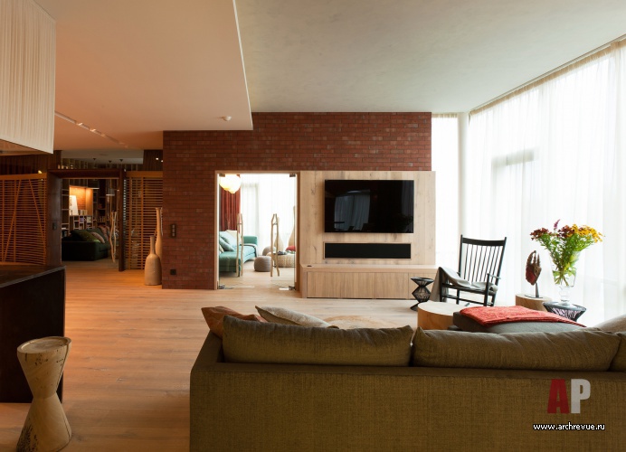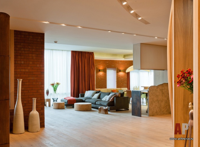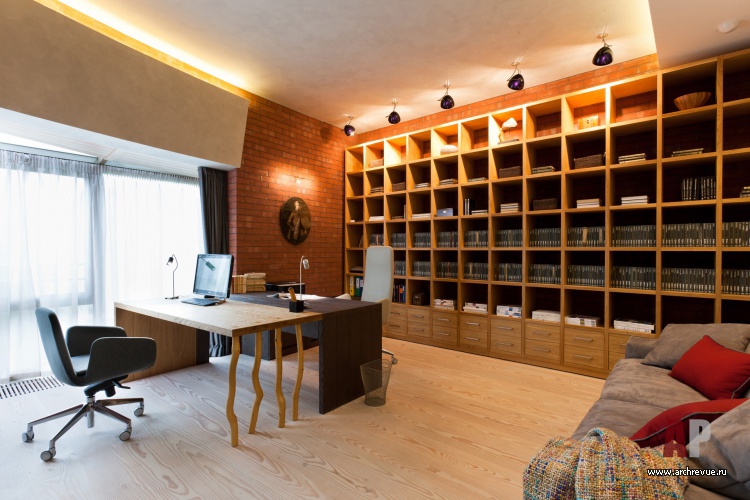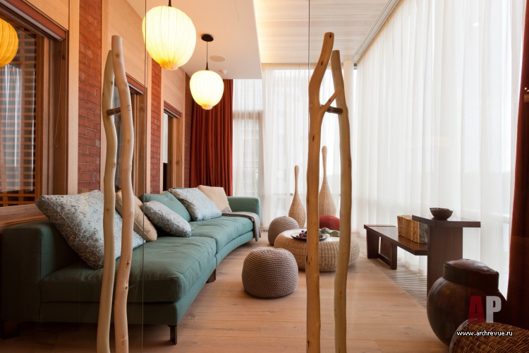 В гостиной их поддерживает оригинальные дизайнерские журнальные столики из массива кедра и барные стулья из венецианских свай; в кабинете, библиотеки и чилл-ауте – ячеистые системы хранения из дерева. Все гостевые помещения объединены отделкой стен из грубого кирпича терракотового цвета.