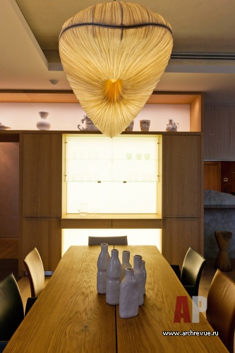 Как часть гостевой зоны воспринимаются расположенные за стеклянными перегородками кабинет, библиотека и чилл-аут. Приватная территория была вынесена в глубину квартиры и обособлена. Технические и подсобные помещения максимально замаскированы с помощью деревянного декора.
