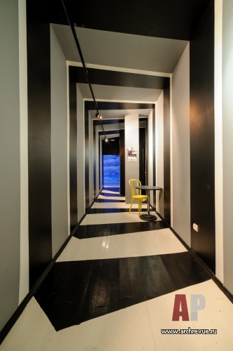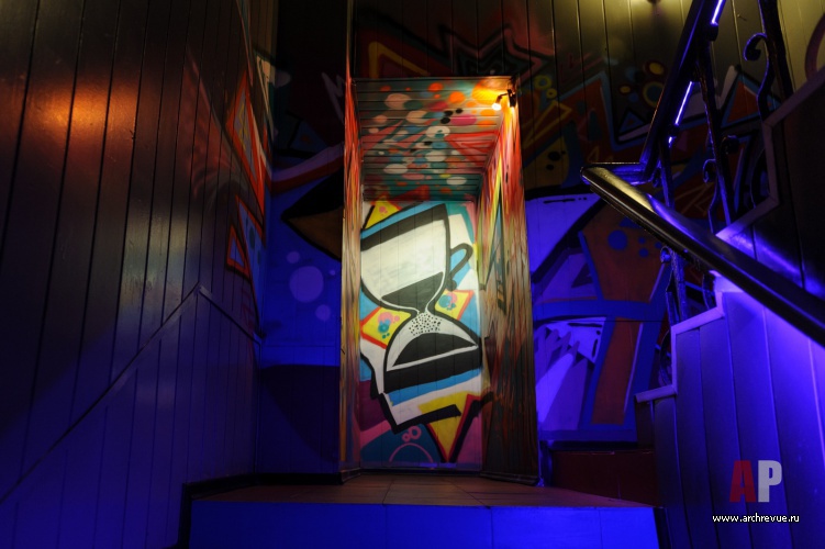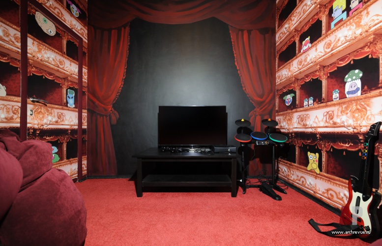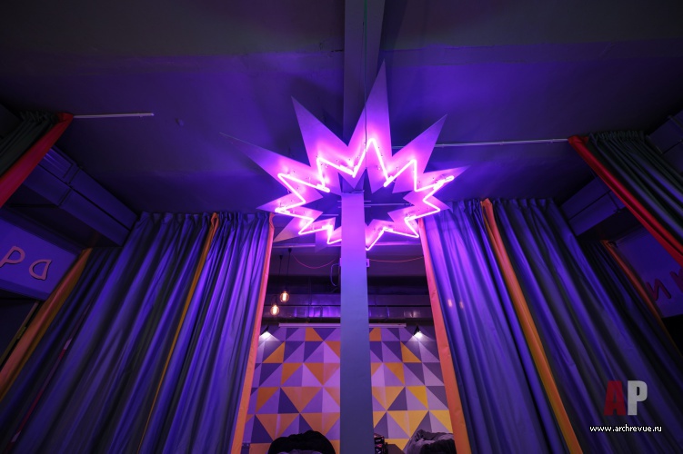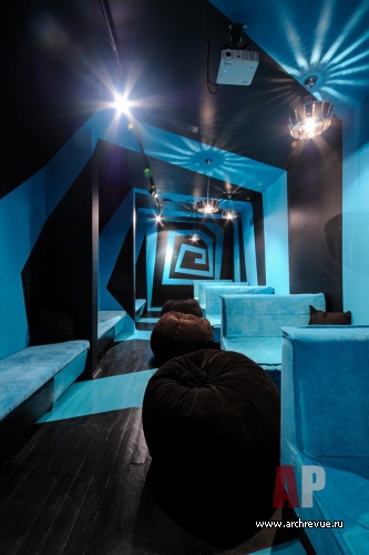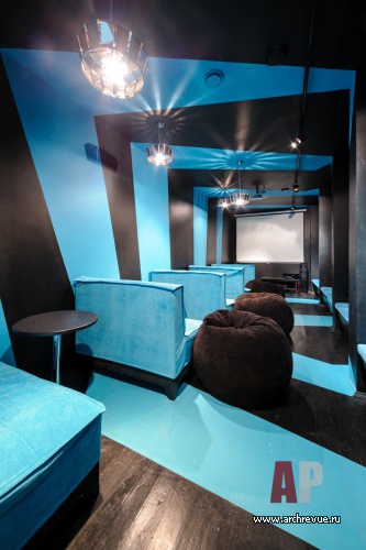 При разработке интерьеров дизайнеры руководствовались идеей создания яркого, немного хулиганского заведения. Поскольку бюджет был ограничен, в оформлении использованы самые простые материалы, но поданные неожиданно. Яркая домината основного зала – неоновая подсветка в форме звезд, кругов, ромбов на потолке. Кинозал решен как помещение с оптическим обманом, в музыкальной комнате использованы фотообои с изображением пышных театральных лож, из которых смотрят герои комиксов.