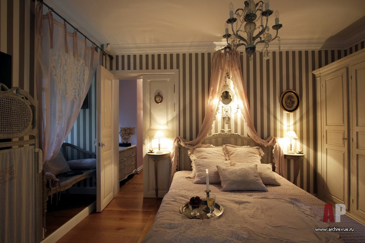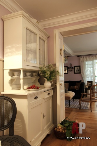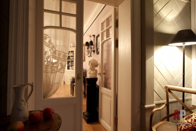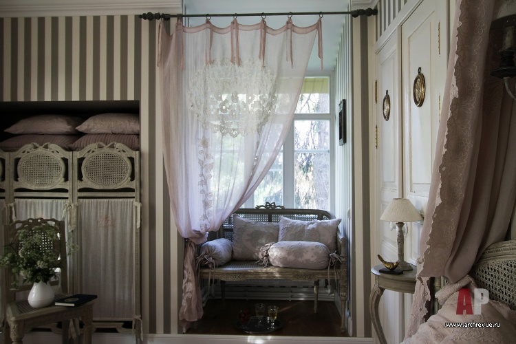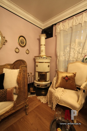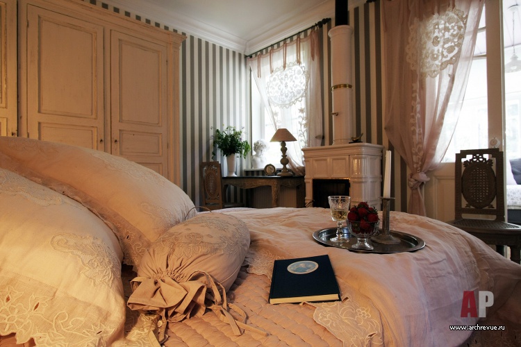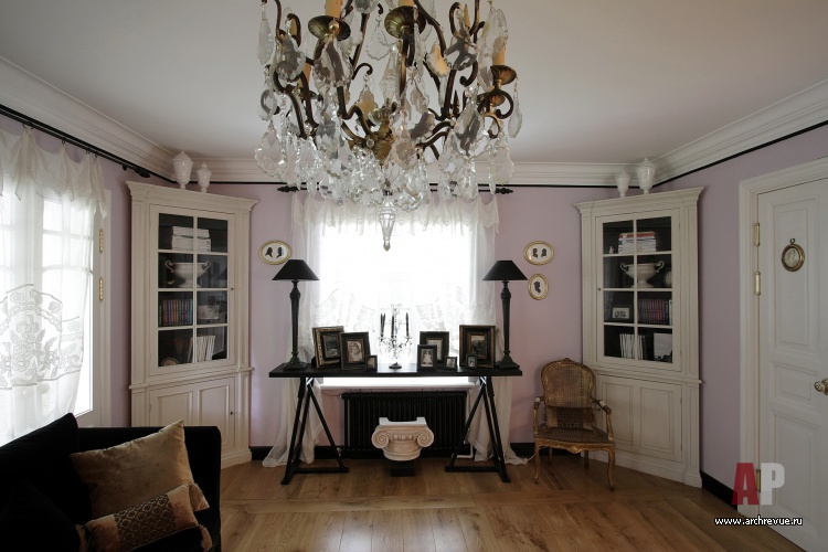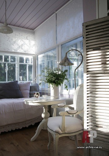 Образ стародачного интерьера строится на нежной, разбеленной цветовой гамме: пастельно-сиреневый цвет стен и текстиля прекрасно оттеняет красоту бережно отреставрированных распашных дверей с филенками из белого с патиной дерева. Светлая массивная деревянная половая доска вызывает в памяти декор бальных залов пышных подмосковных усадеб, а восстановленная и искусно состаренная мебель – личные покои выросшей на французской культуре русской знати.
