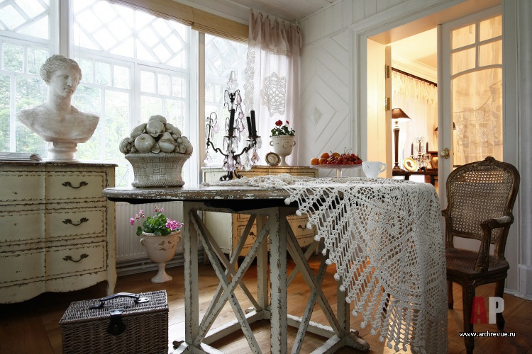 Изысканные лепные карнизы, вручную вышитые занавески, кружевные скатерти, керамические ангелы, семейные фотографии, камеи в овальных рамках, антикварные гравюры – все эти декоративные подробности складываются в подробный интерьер с обаянием прежней жизни.
