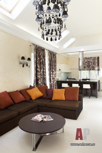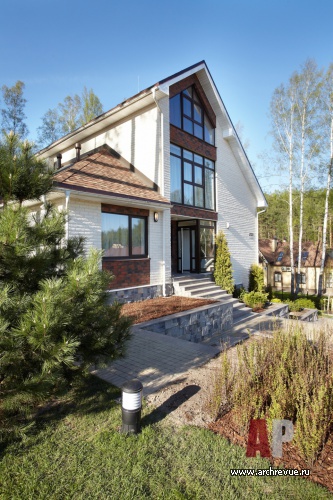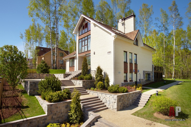 Заказчики – семья с двумя детьми – мечтали о просторном, открытом и ориентированном на природу современном коттедже. Четырехэтажный современный дом писан в разноуровневый рельеф участка, его фасады отделаны натуральными материалами, позволяющими постройке выглядеть единым целым с ландшафтом. Построенный с элементами кантри дом облицован диким светлым камнем и клинкерной плиткой, его кровля покрыта битумной черепицей под дранку.