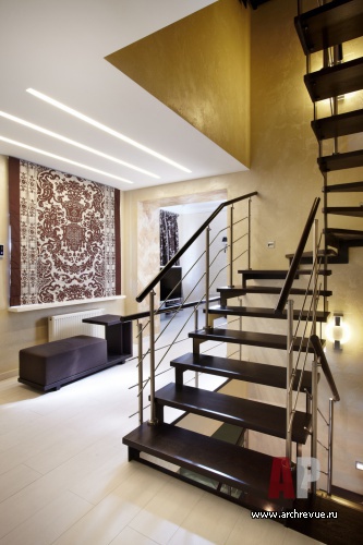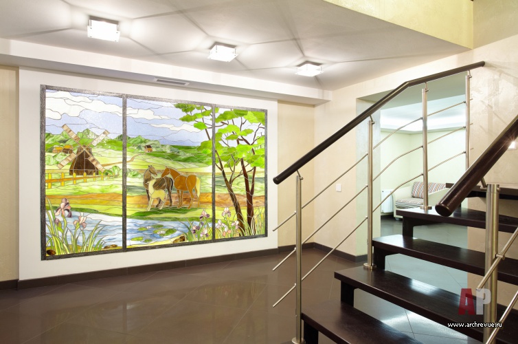 Современную сущность интерьера подчеркивает лестница с перилами из матовой стали, а ориентированность на традиции – художественные витражи в технике Тиффани.
