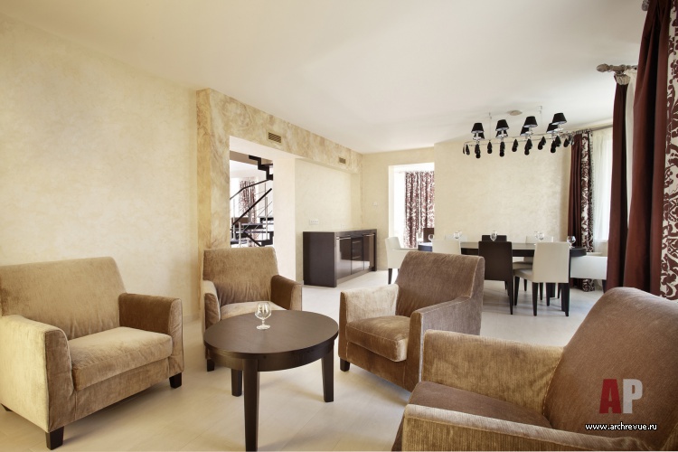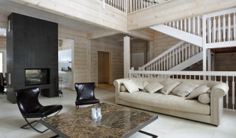 Облик современного дома формируют натуральные материалы и светлые, зрительно увеличивающие объем отделки. Полы во всех парадных помещениях выстланы керамогранитом Rex, имитирующим белую паркетную доску, в приватных зонах использована массивная доска из ясеня. С нейтральными полами прекрасно сочетаются стены, оформленные в технике энкаустика.