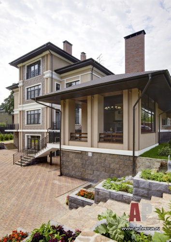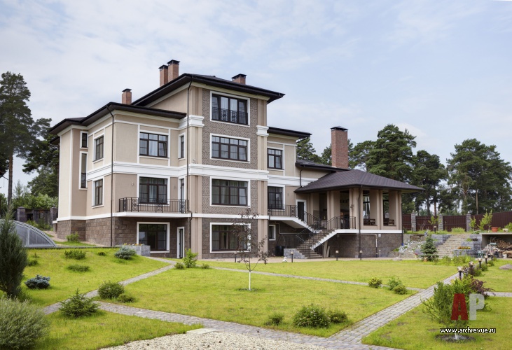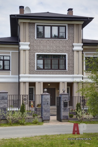Архитекторы спроектировали и расположили здание на участке так, чтобы большая часть жилых помещений была обращена на природный ландшафт и взаимодействовали с ним. Особенность внешнего облика здания – структурированность по вертикали. С помощью разных вариантов отделки растянутый по участку большой объем выглядит стройным, собранным, устремленным ввысь. Оформление центральной части фасадов ажурным резным камнем, лепные молдинги, входные группы с отделкой из гранита и художественная ковка ограждений балконов и террас придают особняку элегантный вид.