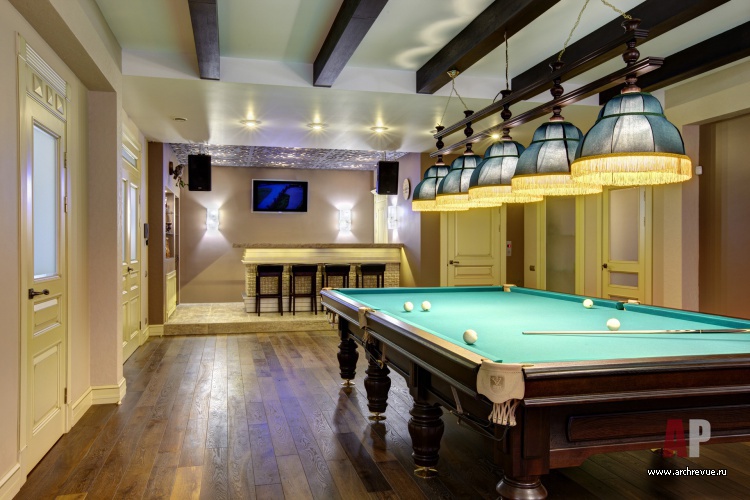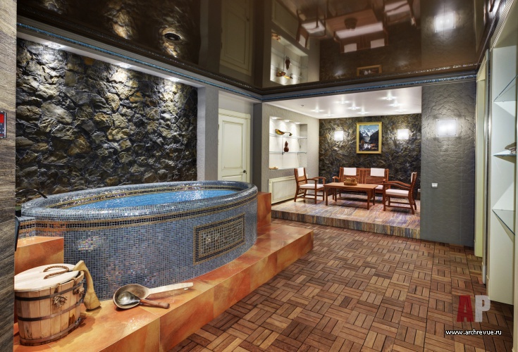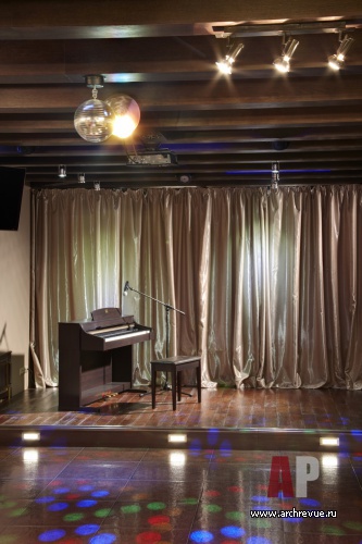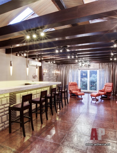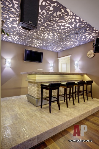 В цокольном этаже находится домашний SPA-салон с сауной, зоной отдыха, тренажерным залом. Первый этаж занимают парадные гостевые помещения: большой холл со стеной из оникса, который продолжается просторной гостиной с камином, и сменяется столовой и кухней. К ним примыкает кабинет и гостевая спальня. Второй этаж отдан приватным апартаментам, он организован по принципу двух изолированных квартир со своими входами. Верхний этаж – зона отдыха со сценой, танцполом и баром.