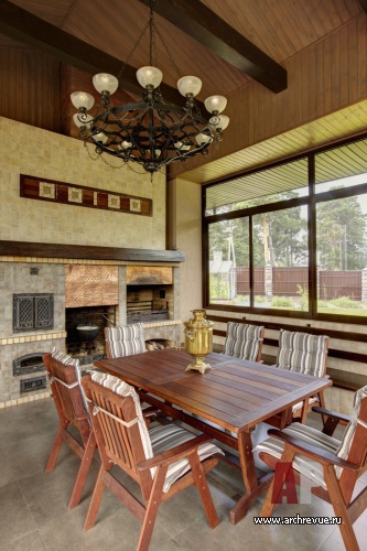 Перед архитекторами стояла задача так организовать пространство, чтобы выделить две разные по назначению группы помещений: личные пространство членов семьи и помещения для светских приемов (музыкальный зал, бильярдная, SPA-центр, барбекю). Функциональные зоны в доме сгруппированы по вертикали.