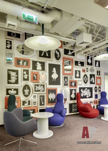Чтобы превратить прямоугольное помещение в сложное, творческое пространство и разместить необходимое количество функциональных зон, авторы пошли по пути использования нетривиальных архитектурных и декоративных средств. В основу яркого проекта легла сказка Льюиса Кэрролла «Алиса в Стране Чудес».