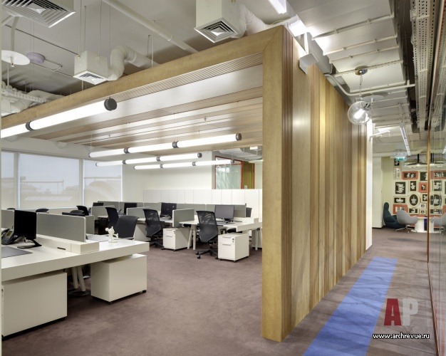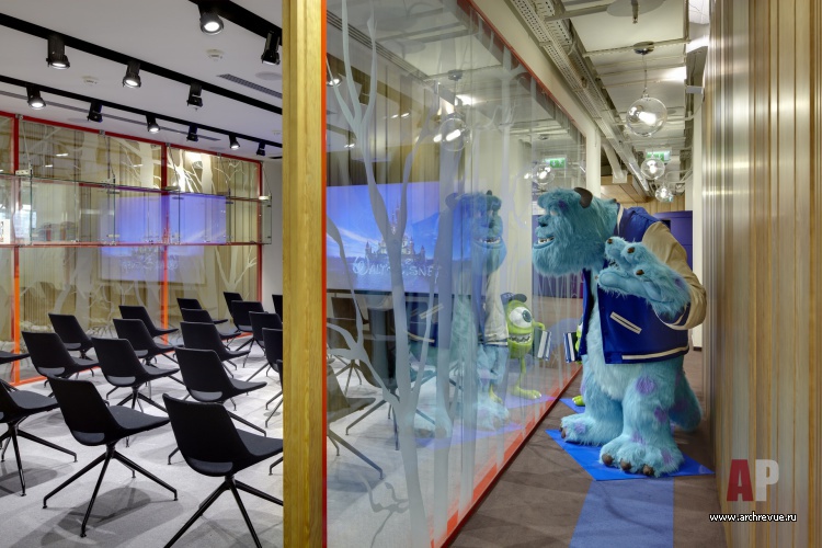 Изначально вытянутое в плане прямоугольное помещение меньше всего напоминало фантазийный интерьер кинокомпании-создателя знаменитых детских мультфильмов. Чтобы визуально его усложнить, авторы предложили превратить его в грамотно продуманный лабиринт, где открытые зоны чередуются со стеклянными блоками кабинетов и переговорных.