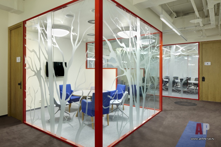 Вырастающие из пола деревянные перегородки и вовсе напоминают стволы деревьев, а открытая система потолочных коммуникаций – их крону. Сказочные деревья изображены и на прозрачных перегородках кабинетов и переговорных. На фоне матовой гравировки в виде сказочного леса органично выглядят герои диснеевских мультфильмов в человеческий рост.