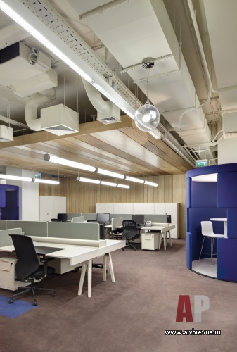 Продвигаясь по синей линии на полу, видишь и open-space различных отделов, и прозрачные кубы переговорных, и изолированные полукруглыми перегородками зоны отдыха сотрудников. Нетривиальное планировочное решение позволило разместить все необходимые для работы офиса помещения в достаточно компактном пространстве и стало базой для фантазийного дизайна.