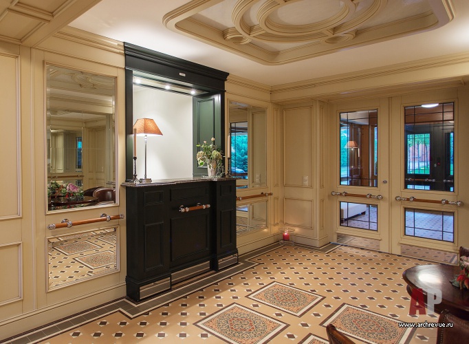 В декоре интерьера общественных зон отеля и номеров использованы мотивы, характерные для домов в горах и традиционных английских особняков. На полу – английская керамическая плитка Original Style и мрамор цвета жасмина, стойка ресепшен зашита буазери из темного дерева, стены выкрашены в английский темно-зеленый или светло-бежевый оттенок.
