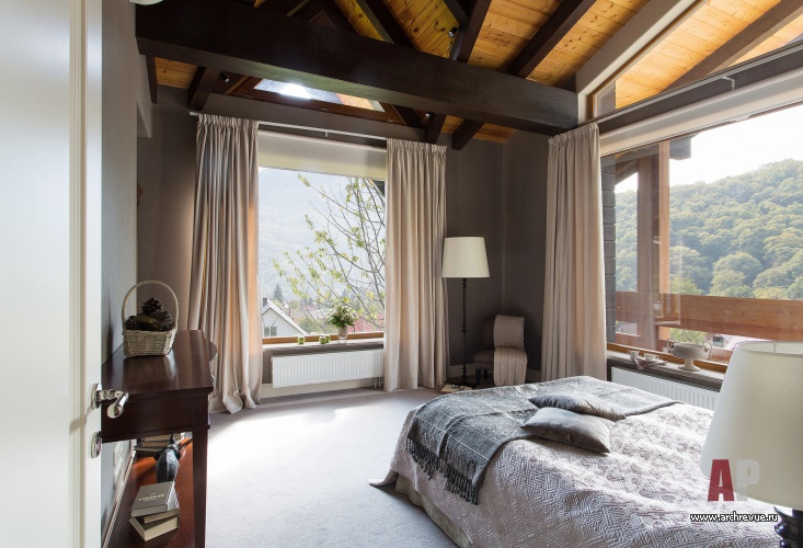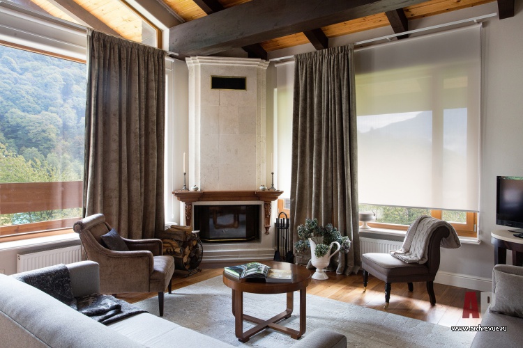 Место, в котором расположен отель, красоты необыкновенной! Именно поэтому, проектируя интерьерную декорацию, мы стремились переключить гостя отеля с интерьера на природу, создать идеальный фон для восприятия ландшафта, нам было важно, чтобы у каждого осталось свое впечатление от места. Отсюда и монохромная цветовая гамма, тактильные материалы, природные отделки. Кроме того, перед нами стояла задача передать ощущение отдыха в горах, и мы ввели элементы шале, поставили камины, печки, где можно приготовить кофе, разложили в номерах уютные пледы.