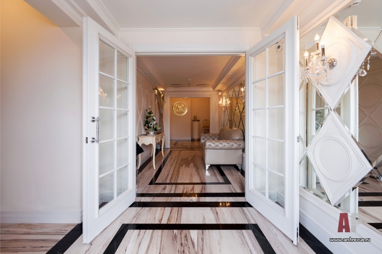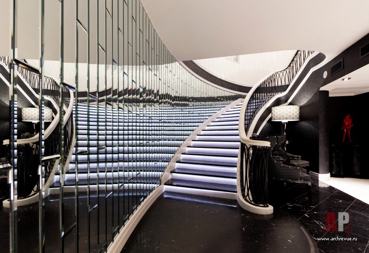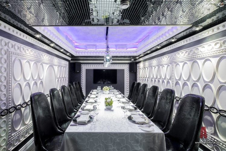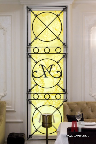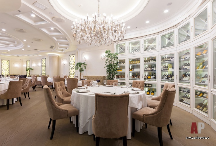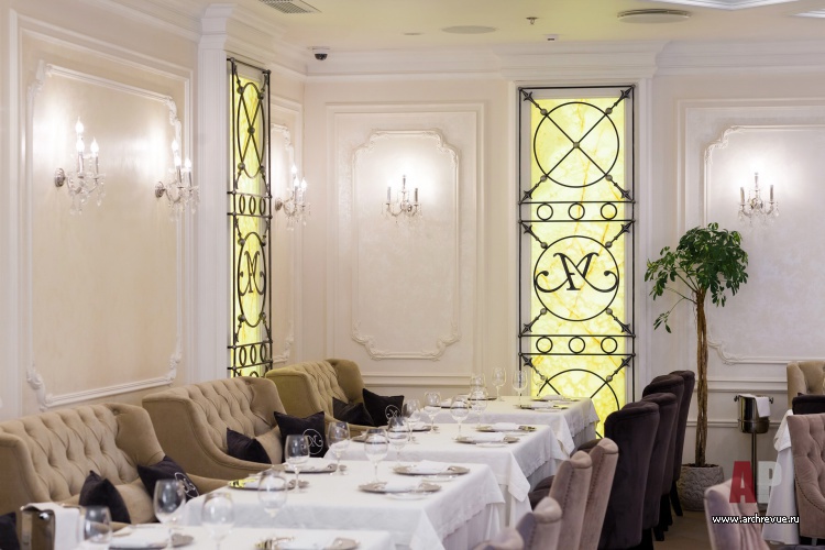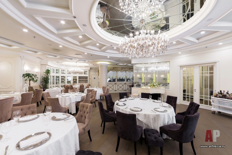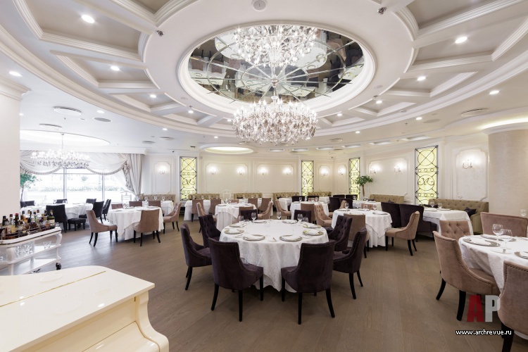 Чтобы попасть в ресторан, нужно сначала пройти через парадный холл с белоснежными дверями и лепными кругами на стенах, потом миновать «ар-декошный» лестничный холл с волнообразной лестницей и зеркальной стеной. Центральный зал ресторана вмещает более 90 гостей: благодаря единому объему в нем чрезвычайно удобно проводить большие банкеты.