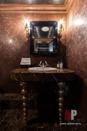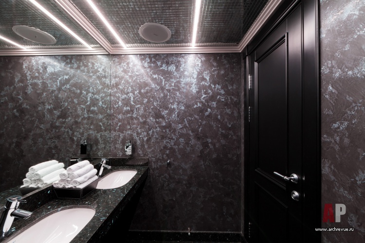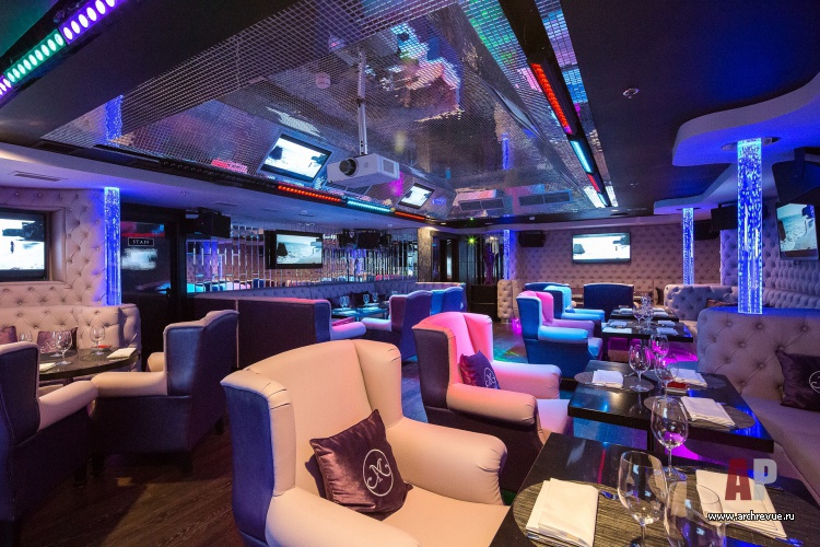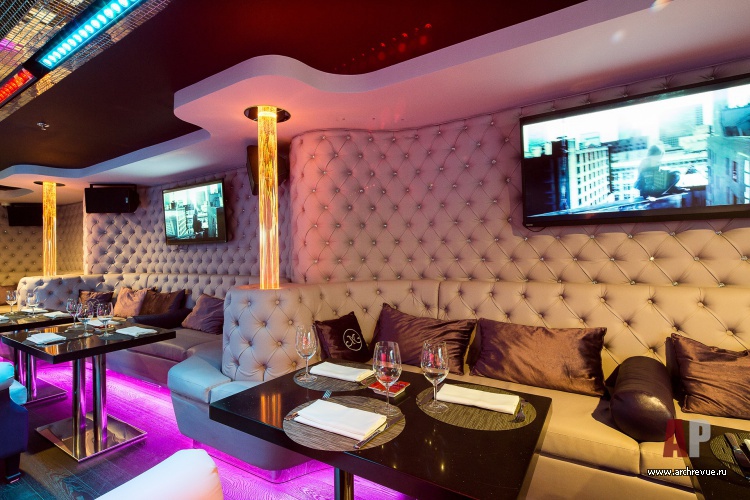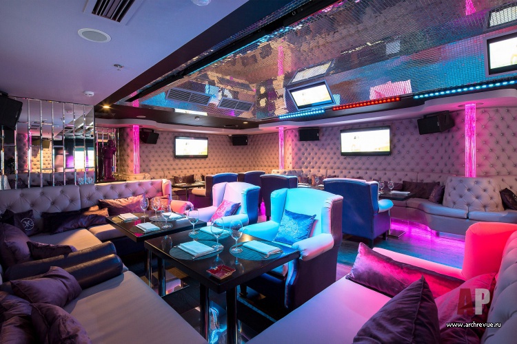 Нижний этаж, где расположен караоке-зал с профессиональной сценой и VIP-кабинет на 12 персон, декорированы в современной стилистике с мотивами ар-деко и гламура.