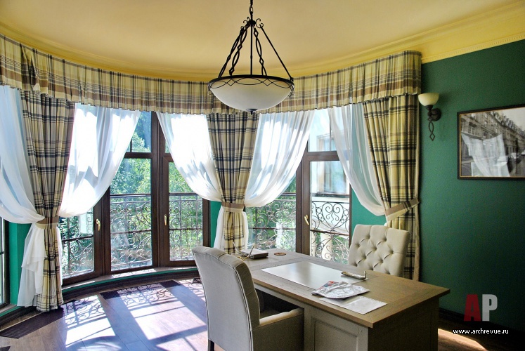 В дизайне интерьера подмосковного особняка прослеживаются черты английского стиля. Гостевые помещения выглядят строго и респектабельно за счет плотной цветовой гаммы (стены выкрашены в сложные оттенки бруснично-красного и сине-зеленого, использованы однотонные матовые краски), кованых элементов декора и деревянных изделий.