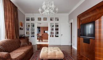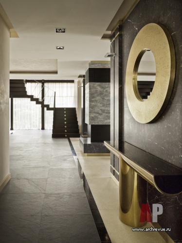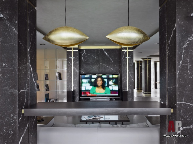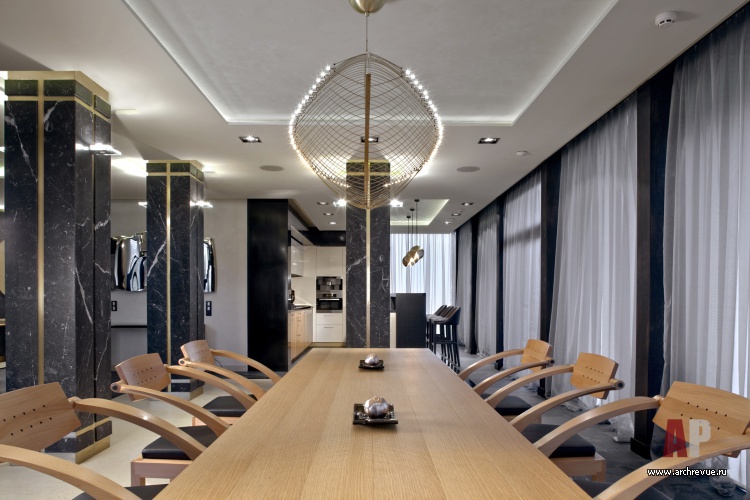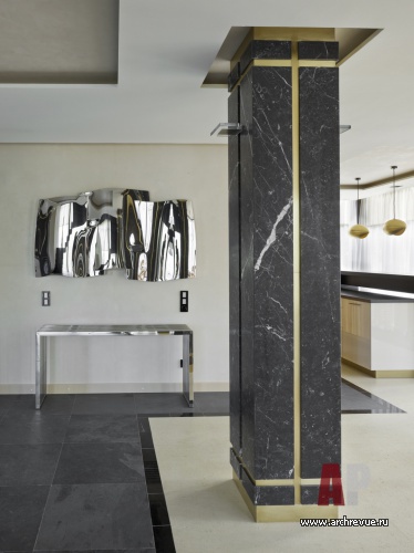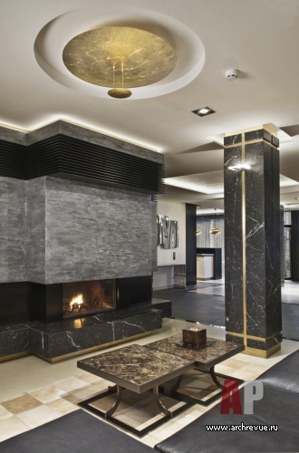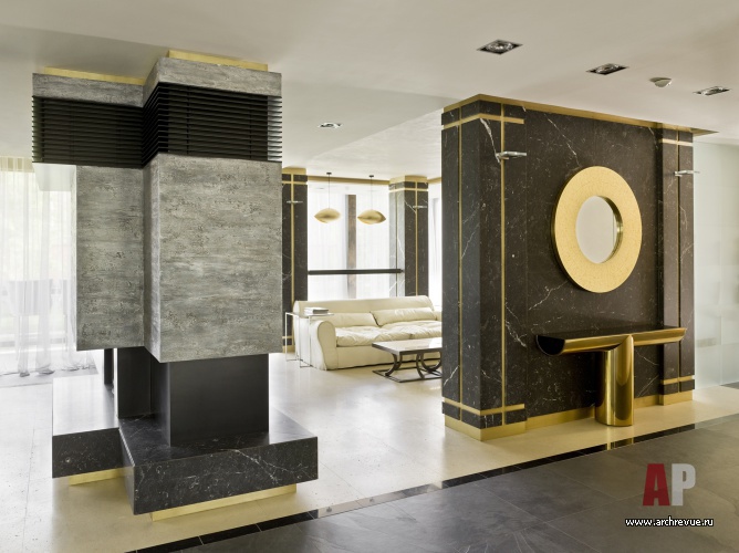 Тема роскоши реализуется в использовании декоративных приемов и материалов, характерных для стиля ар-деко. Лейтмотив интерьера – фактура природного камня: мрамора разных сортов и расцветок, сланца, травертина, гранита. Тон задают одетые в темный полированный мрамор колонны с капителями и раскладками из золотистой сатинированной латуни.