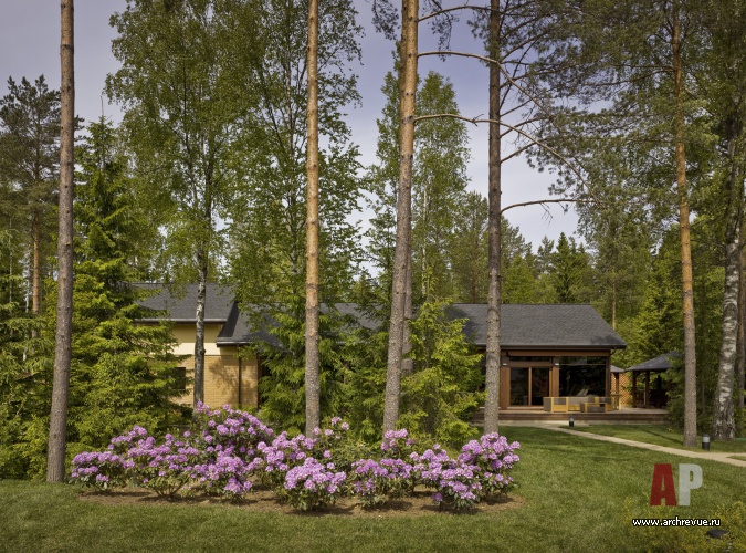 Двухэтажный дом с большой плоскостью остекления построен по фахверковой технологии в живописном пригороде Санкт-Петербурга, вблизи Финского залива. Девелопер возводил здание для продажи, и, хотя владелец у него и появился довольно скоро, первое время дизайнерам пришлось общаться с заказчиком через инвестора.