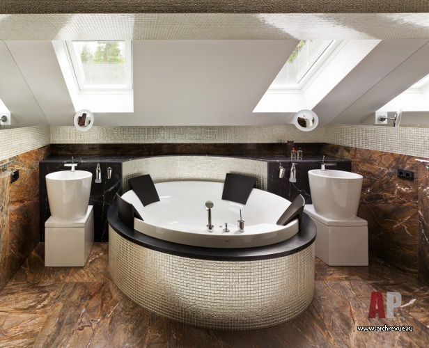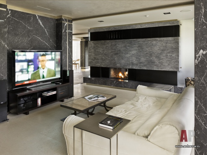 Конструктивная особенность дома площадью 400 кв. м – большое количество опорных столбов, их архитекторы не стали скрывать, а, напротив, облицевали мрамором и сделали главными действующими лицами пространства. По сути, мраморные колонны и массивный двухсторонний камин – единственные элементы зонирования в open space первого этажа.