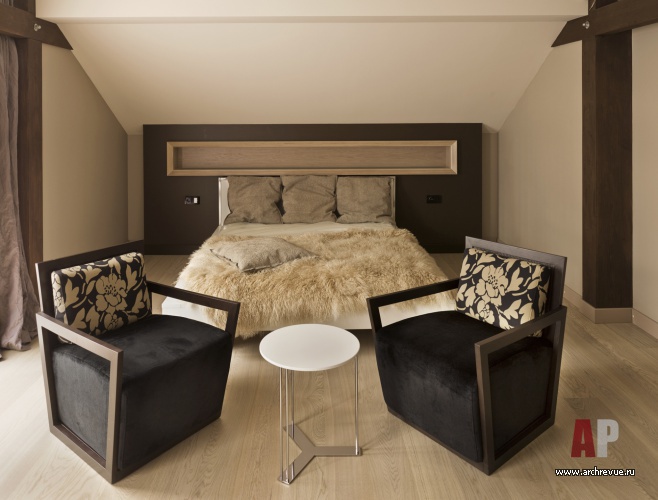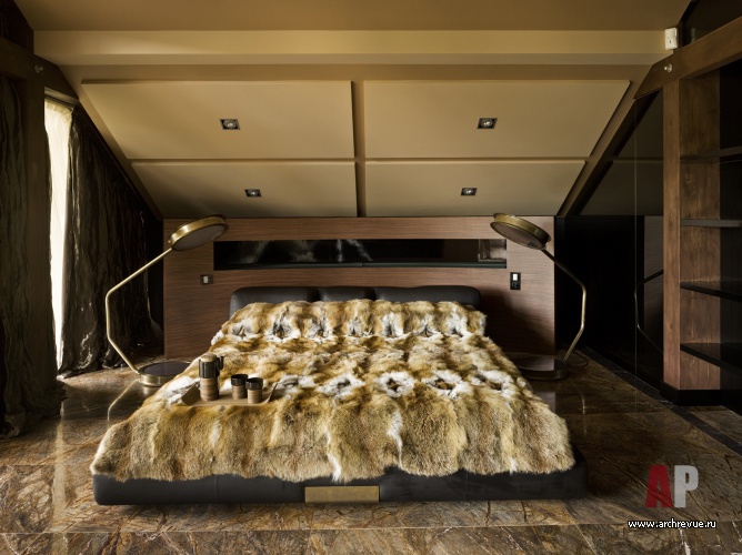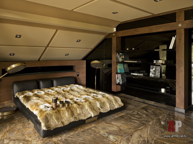Сланцевая полоса в отделке пола визуально делит пространства на два крыла и вместе с тем рифмуется с отделкой двухстороннего брутального камина с эффектом дикого камня. Парадное настроение создает и цветовая гамма: черное с золотом – излюбленное сочетание аристократов. В приватных помещениях в поддержку к камню использованы теплые фактуры: палисандр, кожаные панели, меховые покрывала.