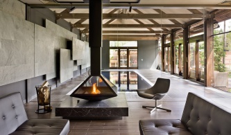 Единственное пожелание, которое четко было озвучено – современная стилистика, в остальном авторам пришлось действовать на свое усмотрение, руководствуясь особенностями местности, конструкцией дома с большим количеством несущих колонн и логикой зонирования для комфортного проживания на природе. В итоге был создан открытый на природный ландшафт современный дом с мотивами ар-деко и натуральными материалами с красивой фактурой: травертином, мрамором, сланцем.