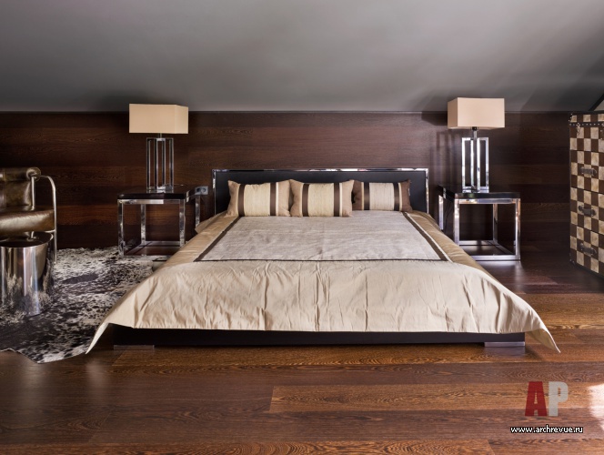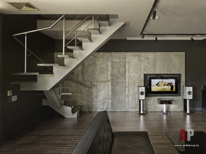 Отдельное помещение с лестницей на второй этаж занимает домашний кинотеатр. Гостевые спальни размещены на верхнем этаже.