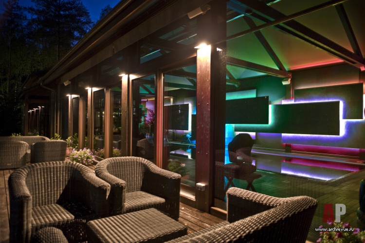 В оформлении интерьера помещений для отдыха и релакса ставка сделана на натуральные материалы, которые подчеркивают связь архитектуры и ландшафта. Основной лейтмотив дизайн-проекта – фактура природного сланца серого цвета. Шпонироваными панелями из сланца облицованы стены и даже двери. Основной декоративный акцент бассейна – уникальный настенный RGB-светильник.