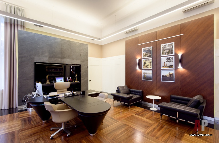 Комплекс офисных помещений руководителя организации включает в себя приемную, зал для совещаний, рабочий кабинет и малый кабинет с зоной для отдыха и неформального общения. Отдельным блоком выделен комплекс «мокрых зон» - большая ванная комната с душевой.