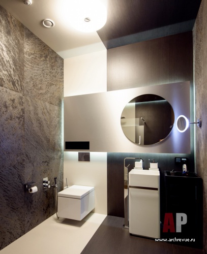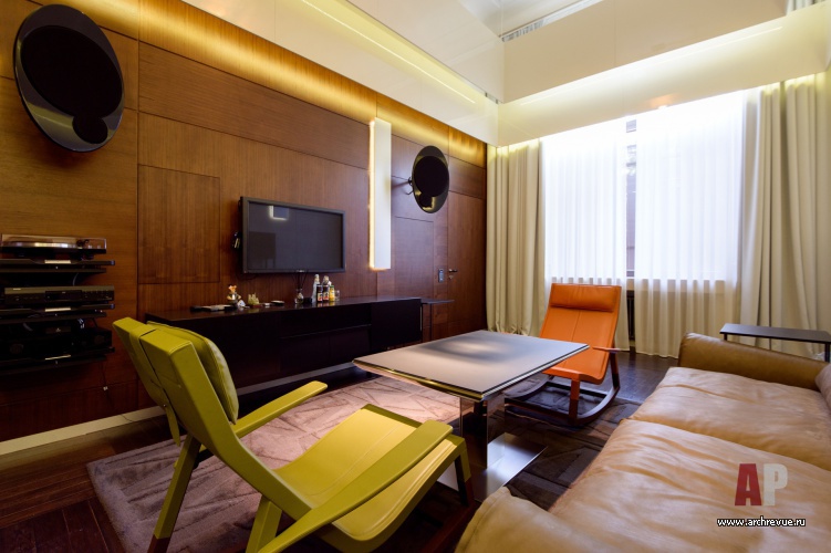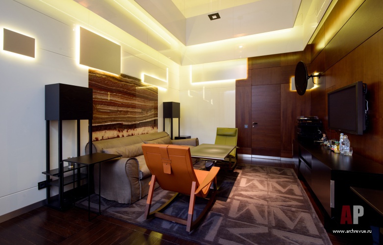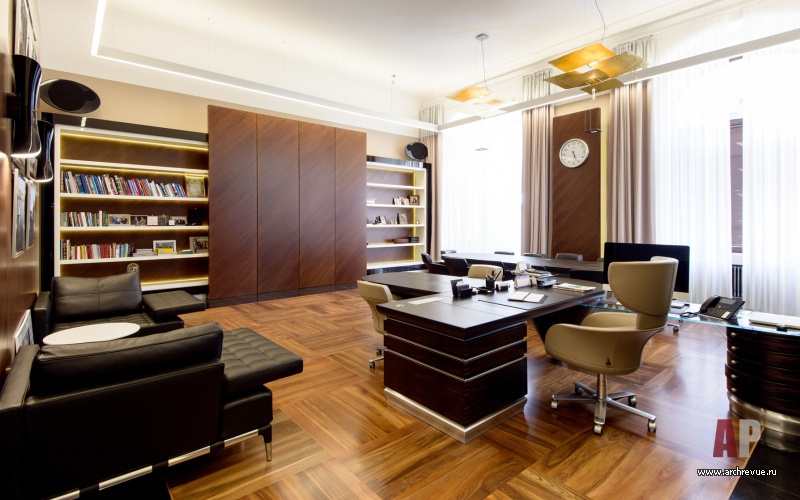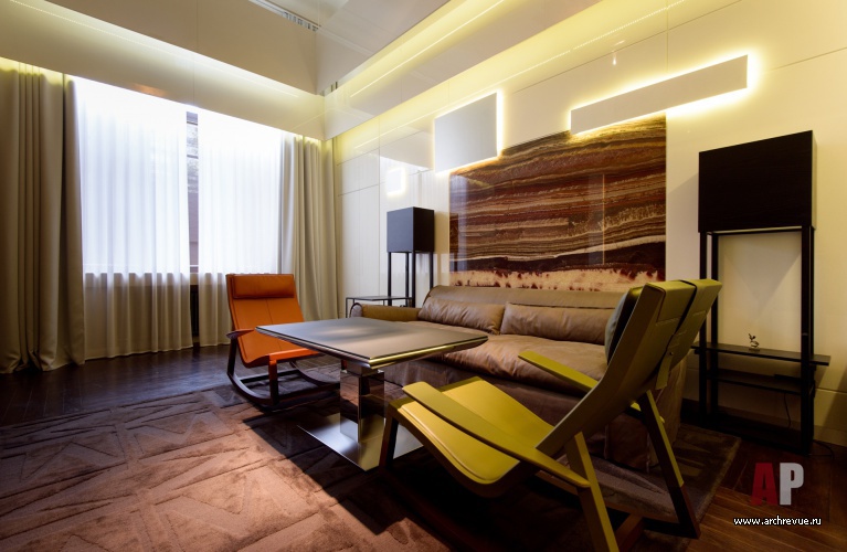 Высокий статус и интеллигентность подчеркивается использованием натуральных материалов с интересной фактурой: дерева (ореховые панели), сланца, полированных поверхностей и мебели от именитых итальянских фабрик.