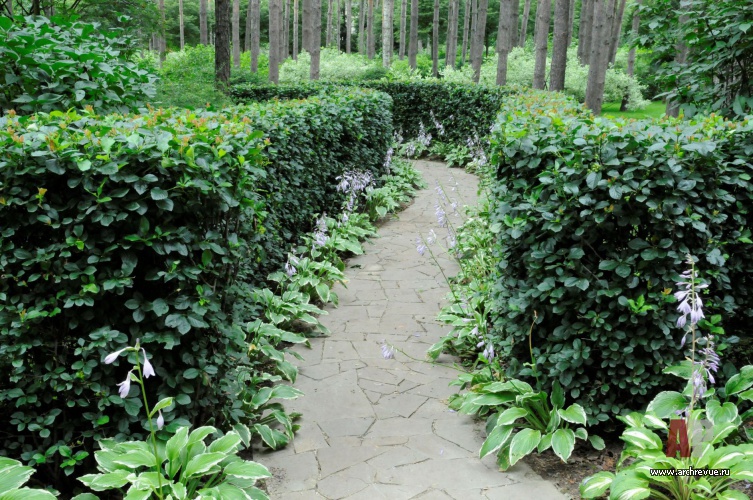 Все основные дорожки отделаны гранитом, чтобы покрытие было идеально ровным и вечным, в лесной зоне тропинки выполнены из песчаника, а огород отсыпан озерной галькой. Вблизи павильона-кухни в зоне барбекю авторы разбили огород и установили средневековый фонтан XVII века, привезенный из французского монастыря. Как и было принято в средневековых монастырях, фонтан окружили высокой изгородью из липы мелколистной. Сама по себе такая уникальная деталь задает определенное настроение и придает саду очарование старины.