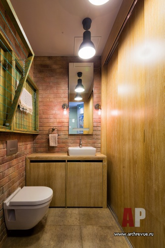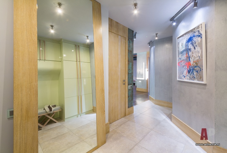 На контрасте с брутальными изделиями из металла и бетонными штукатурками работают предметы из дерева с теплой, шероховатой фактурой. В прихожей индустриальной стилистике противопоставлен дизайн встроенных гардеробных в нежном фисташковом цвете. В интерьере реализовано множество уникальных разработок из дерева и металла. Например, стальные индустриальные балки для мобильного подвеса спортивного инвентаря в детской комнате, а также люстра над обеденным столом в оплетке из красного шелка.