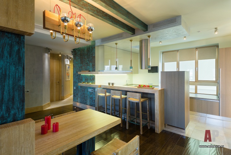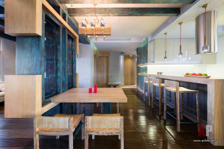 Сценография пространства интерьера с восточными корнями разворачивается вокруг оформления внешней стены гостевого санузла. Обшивка стены медной черепицей с зелено-голубой патиной напоминает панцирь дракона. Однажды использованный в дизайне мотив повторяется в оформлении барной стойки кухни и в конструкции двухстороннего стеллажа с коллекционным японским фарфором.