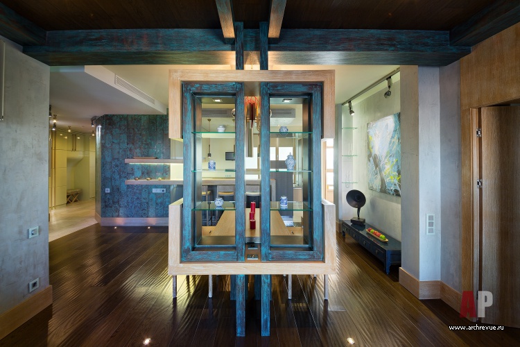 Основное пространство интерьера решено в виде студии и объединяет зоны кухни, барной стойки, обеденной группы и мягкой зоны. В соответствии с традициями Востока отдельно выделена зона чайной церемонии. Многофункциональное пространство разделяет архитектурный акцент - стеллаж, на котором разместилась коллекция восточного фарфора хозяйки.