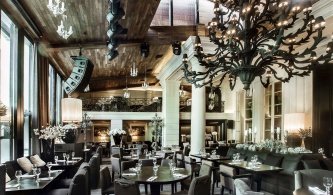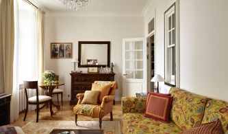 Интерьер особняка имеет камерный характер. В его оформлении использованы натуральные материалы с природной фактурой. Темное дерево в отделке стеновых панелей, камина, сводчатого потолка гостиной и библиотеки рифмуется со светлым камнем и декоративными штукатурками. Цветовая гамма кофе со сливками придает интерьеру строгость и респектабельность.