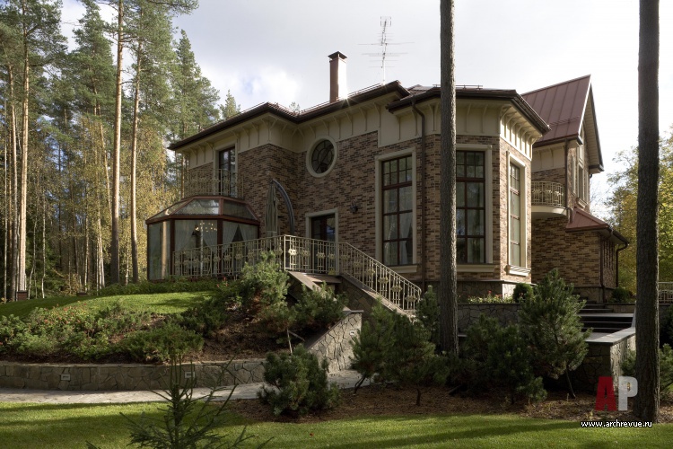 Кирпичный дом с двусветной гостиной и зимним садом расположен в курортной зоне вблизи Санкт-Петербурга. Экстерьер и интерьер коттеджа выполнены в единой стилистке, в которой заметны черты неоклассики и ретро. Среди характерных особенностей постройки: двусветная гостиная со сводчатым потолком, а также большой стеклянный эркер, отсылающий к оформлению традиционных английских зимних садов.