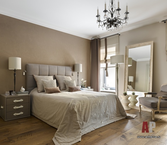 Большая часть поверхности стен выкрашена матовой краской в нейтральные оттенки серого цвета, в цвете off-white выполнены и высокие (2,30 м) двери. Шторы, обивка диванов и кресел выполнены из натуральных смесовых тканей: хлопка, льна, шерсти.