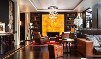 В оформлении эклектичного интерьера ставка сделана на натуральные материалы с природными фактурами. Так, полы выстланы широкой грубо соструганной дубовой доской, кухонный фартук облицован напиленным на тонкие полоски мрамором, а стены спальни отделаны штукатуркой с имитацией замшевых панелей.