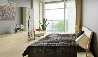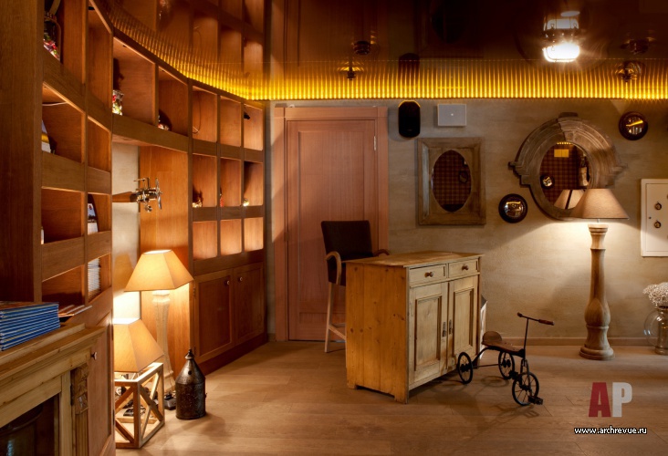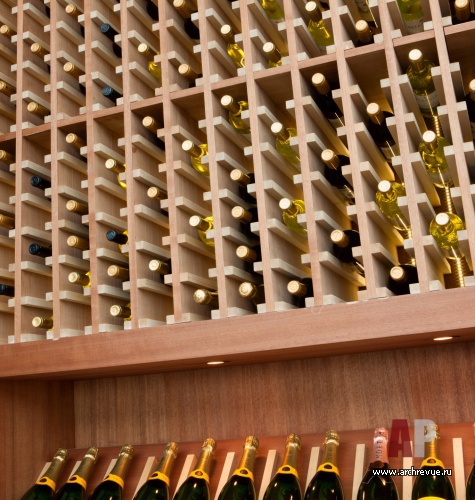 На домашнюю обстановку работают и деревянные изделия. Стеллажные конструкции открытой кухни, столы, диваны, двери, винные и барные стеллажи были изготовлены по авторским эскизам бюро из массива и шпона красного дерева.